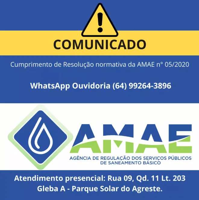 Para mais informações, entre em contato com a Ouvidoria da AMAE: (64) 3602-8686 ou via WhatsApp (64) 99264-3896.